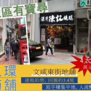 地址;上環文咸東街56-58號金豐大廈地下E號舖 面積(連入則閣);合共約1,200平方呎 售價;4,200萬元