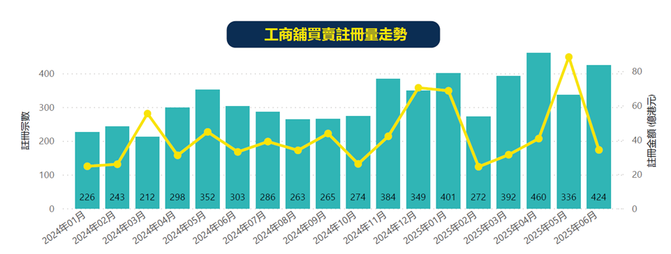 2025年6月,整體工商舖註冊量再度突破400宗,達424宗,按月上升約26.2%。,按月增加26.2%。撇除5月份中環交易廣場價值63億元的「大刁」後,6月註冊金額仍按月增長約34.8%,反映市場交投持續回穩。