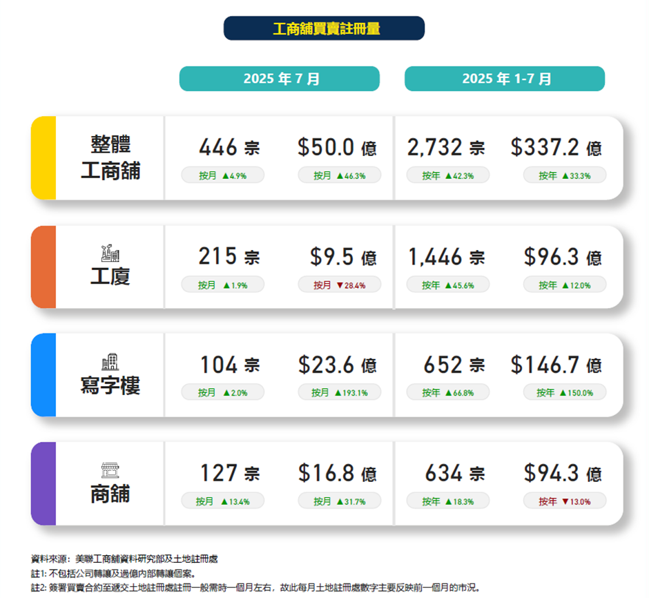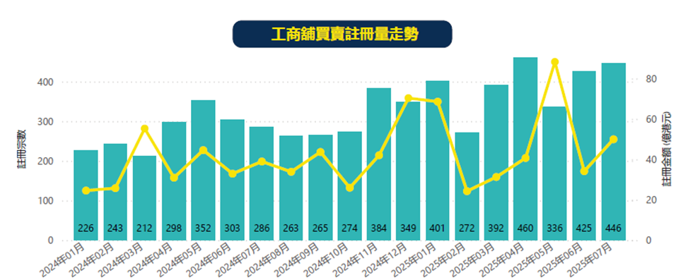 根據美聯工商舖資料研究部綜合土地註冊處資料,2025年7月工商舖市場表現不俗,期內共錄得446宗註冊成交,連升2個月,按月升約4.9%,註冊金額則錄約50億元,按月大增約46.3%。其中,二手物業主導市場,佔總成交宗數及金額高約9成,反映市場資金充裕,以及投資者對二手物業的興趣持續提升。