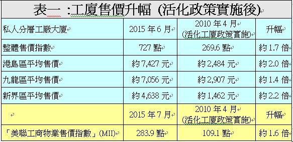 美聯工商董事陳偉志表示,政府於2010年4月開始實施活化工廈政策,至今己接近五年半時間,工廈售價已迅速飆升。根據差餉物業估價署資料顯示,私人分層工廠大廈售價指數由2010年4月的僅269.6點,急升約1.7倍至今年6月份的727點,升幅顯著。而港島區、九龍區及新界區私人分層工廠大廈平均售價更分別由2010年4月的約2,484元、2,907元及1,462元,急升約2倍、1.4倍及2.2倍,至今年6月份的約7,427元、7,056元及4,638元。而根據「美聯工商物業售價指數」(MII)最新7月報283.9點,較2010年4月的109.1點亦己大升1.6倍,可見活化政策對工廈售價帶來正面刺激作用。