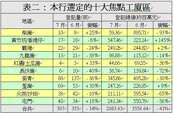 由本行選定的十大焦點工廈區,上月僅錄307宗工廈買賣登記,按月減少14%;涉及登記總值約20.84億元,按月下跌41%,量值齊跌。其中共有6個地區工廈登記量報跌,其中長沙灣區僅錄6宗登記,按月大減40%最多;登記總值亦按月急跌72%至約0.39億元。九龍灣亦僅錄13宗登記,按月減少38%,減幅居次;登記總值約0.99億元,按月減14%。